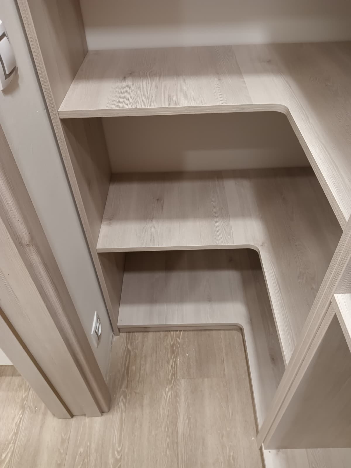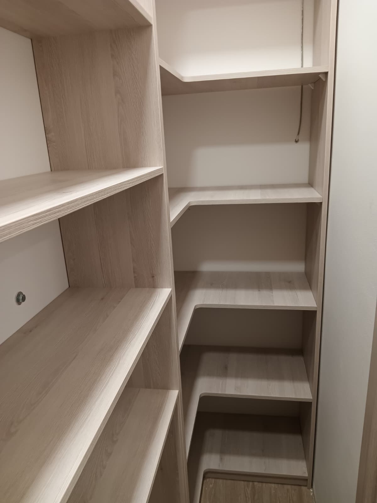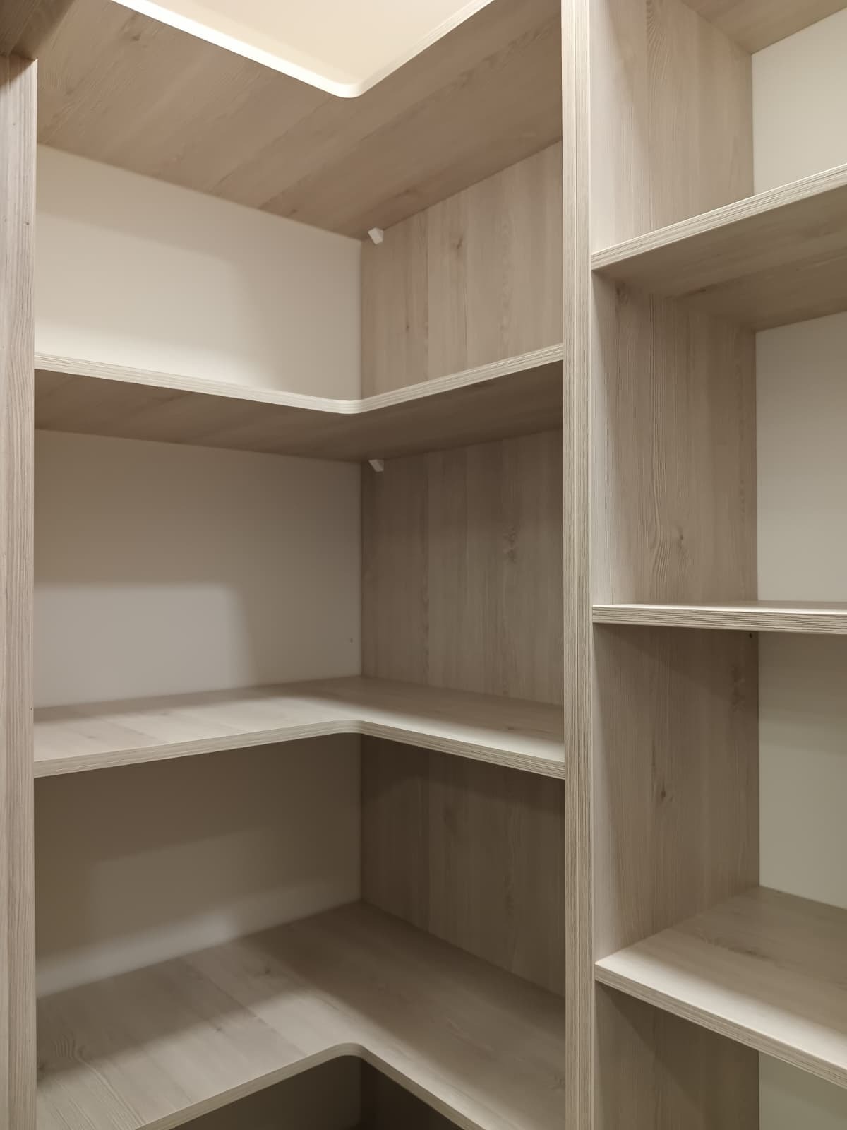 Tato realizace je důkazem, že i čistě praktický prostor, jako je spíž, může mít vysokou estetickou hodnotu. Frézované oblouky dodávají policovému systému lehkost a nádech klasického řemesla.