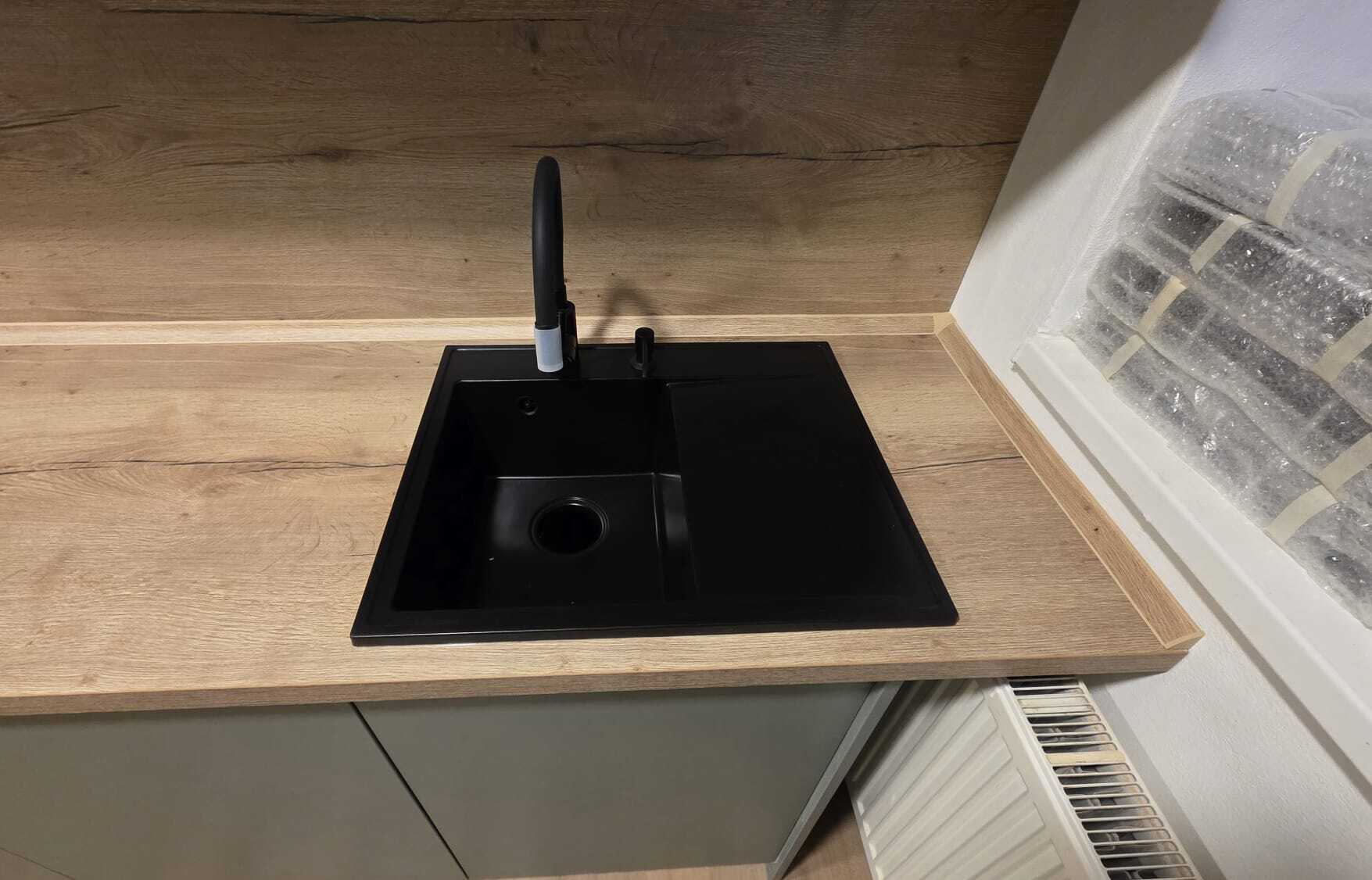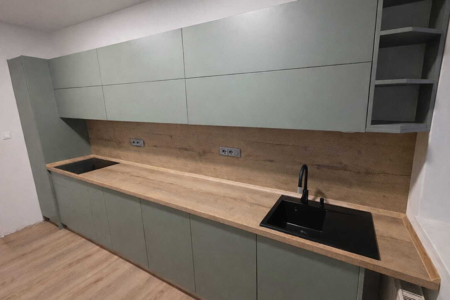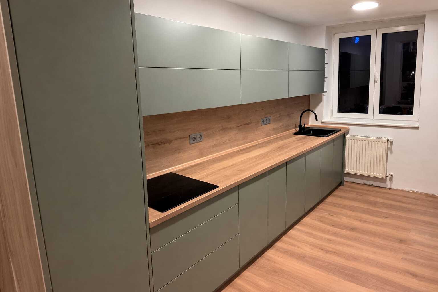Eukalyptová zelená patří mezi aktuální trendy – a tato realizace ukazuje proč. Jemný pastelový odstín v kombinaci s černými vestavnými spotřebiči a doplňky vytváří uklidňující a nadčasovou atmosféru. Výsledkem je moderní interiér, který působí svěže a zároveň domácky.