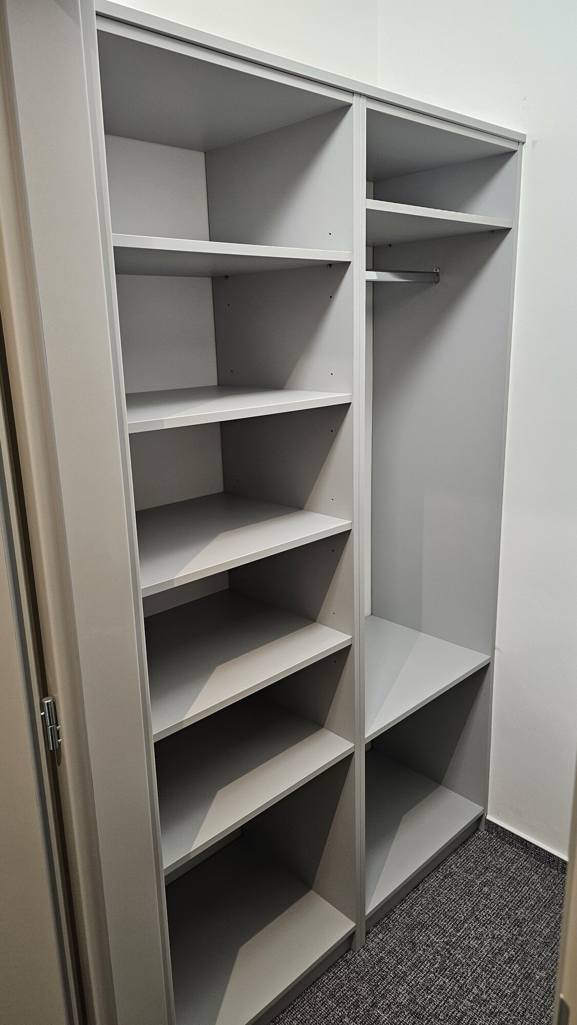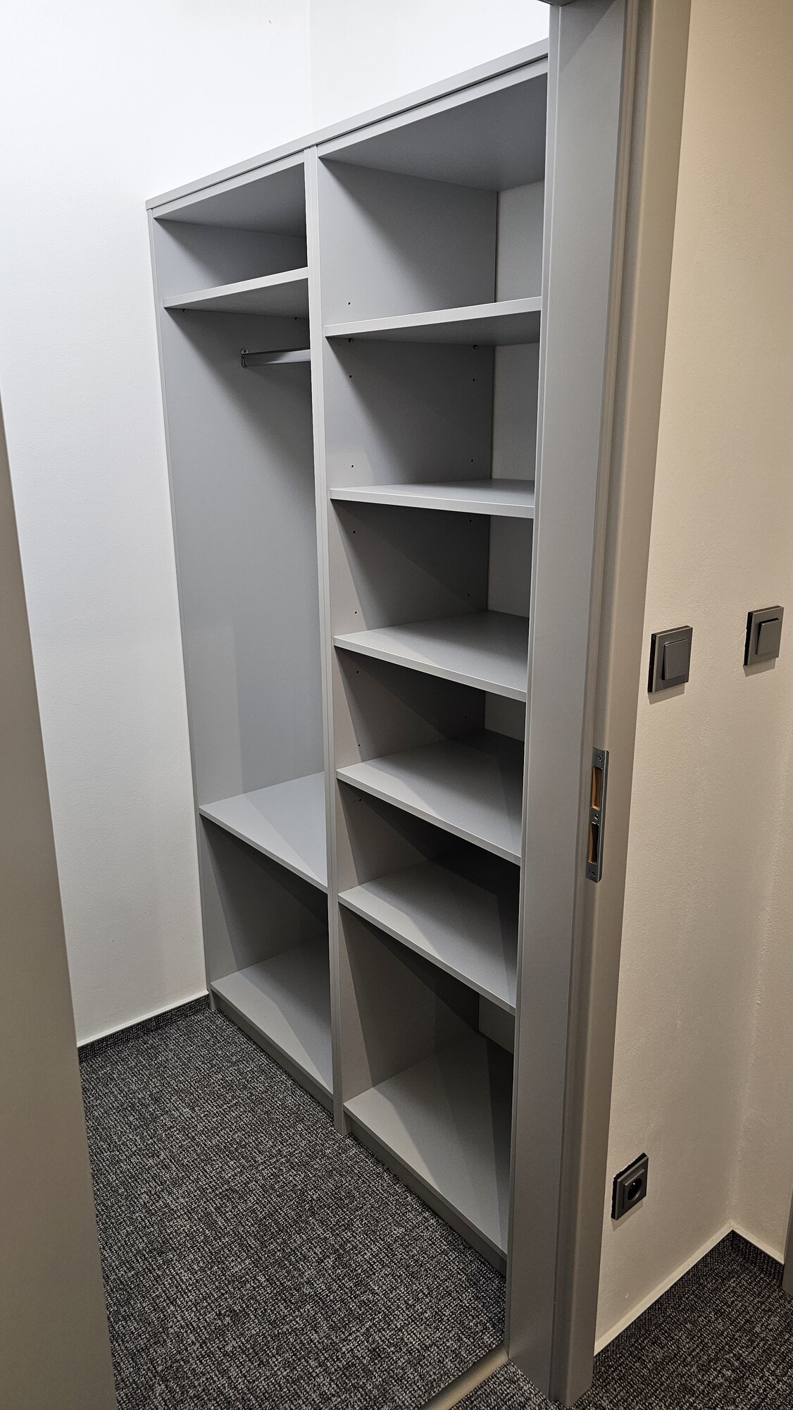Tato šatna s policovým systémem nabízí praktické a přehledné úložné řešení s dostatkem otevřených polic, které usnadňují organizaci oblečení i doplňků. Každá police i výška úložných ploch byla přesně přizpůsobena rozměrům prostoru tak, aby vyhovovala potřebám každodenního života klienta.