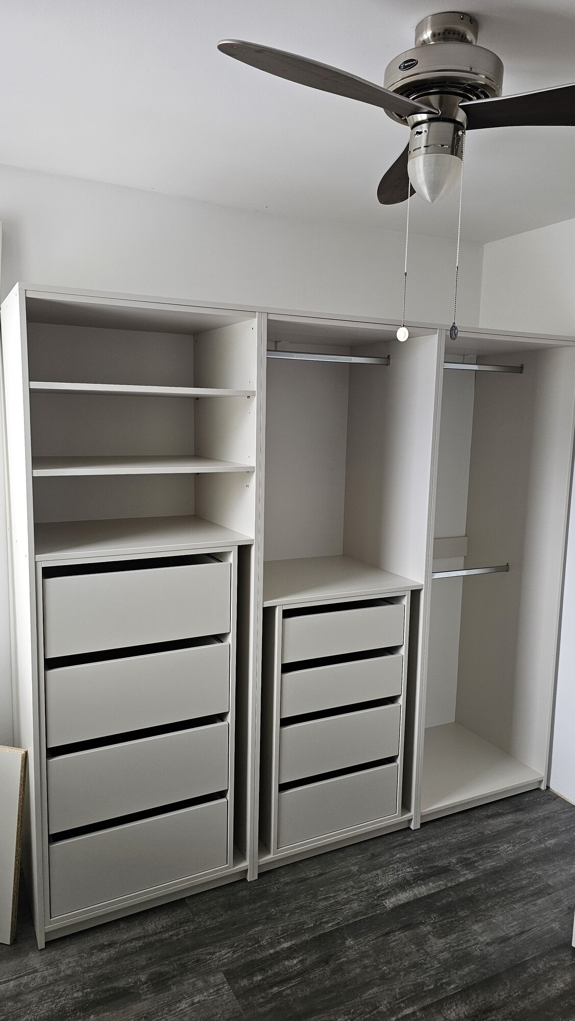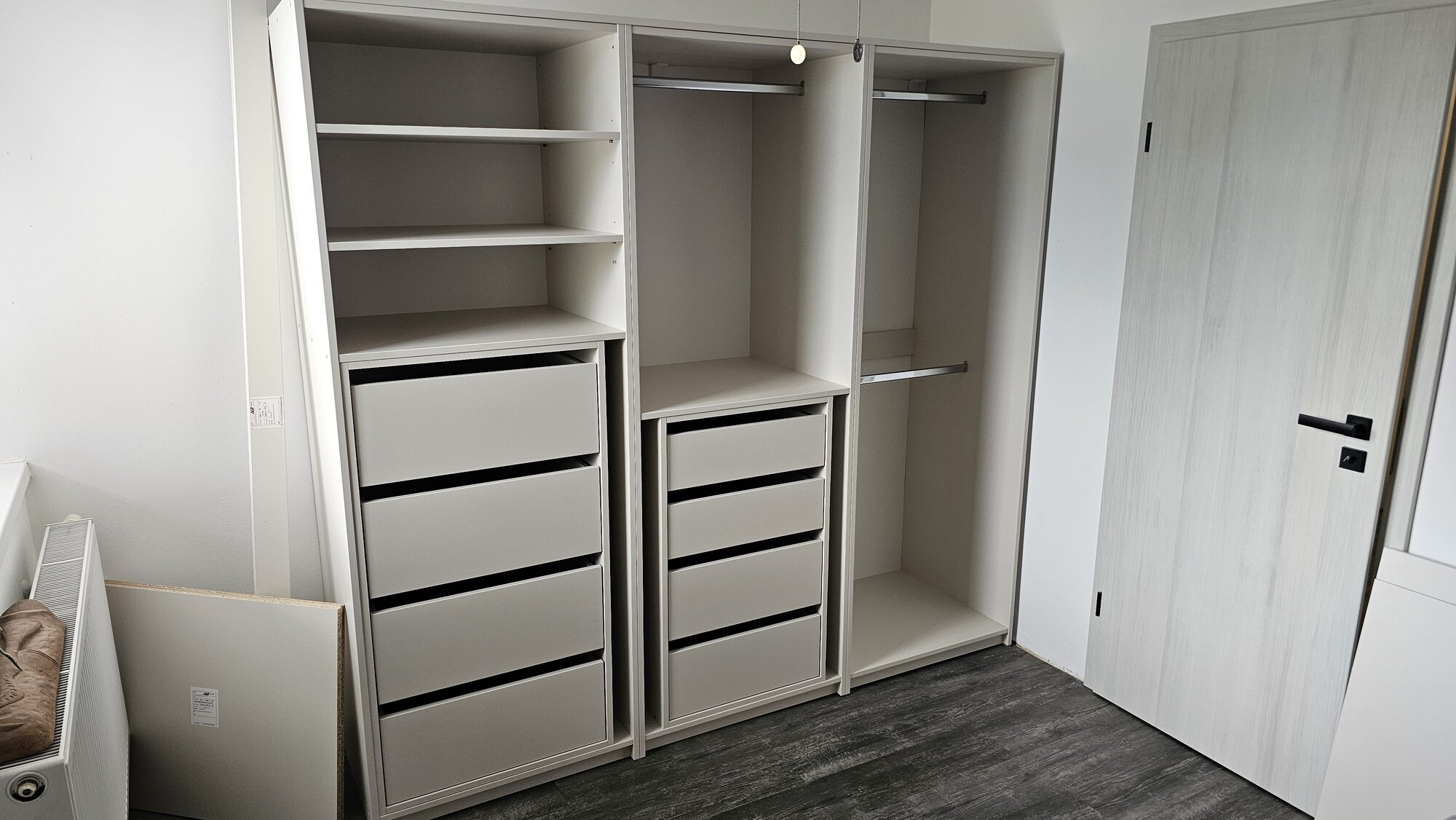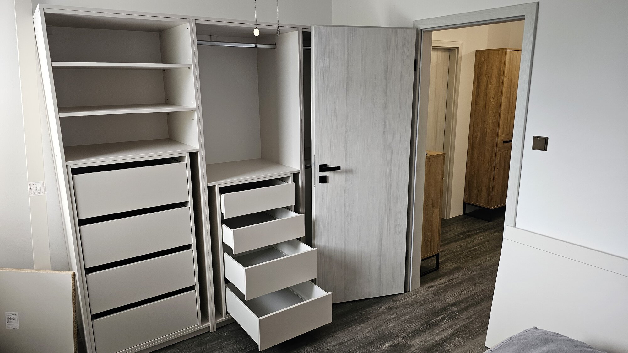 Vestavěná skříň byla navržena s důrazem na promyšlené členění a dostatek zásuvek pro přehledné uspořádání oblečení. Díky funkčnímu vnitřnímu řešení umožňuje snadný a pohodlný přístup ke každému kusu.