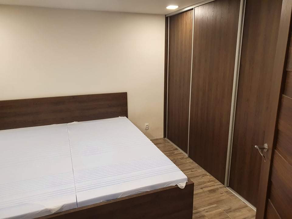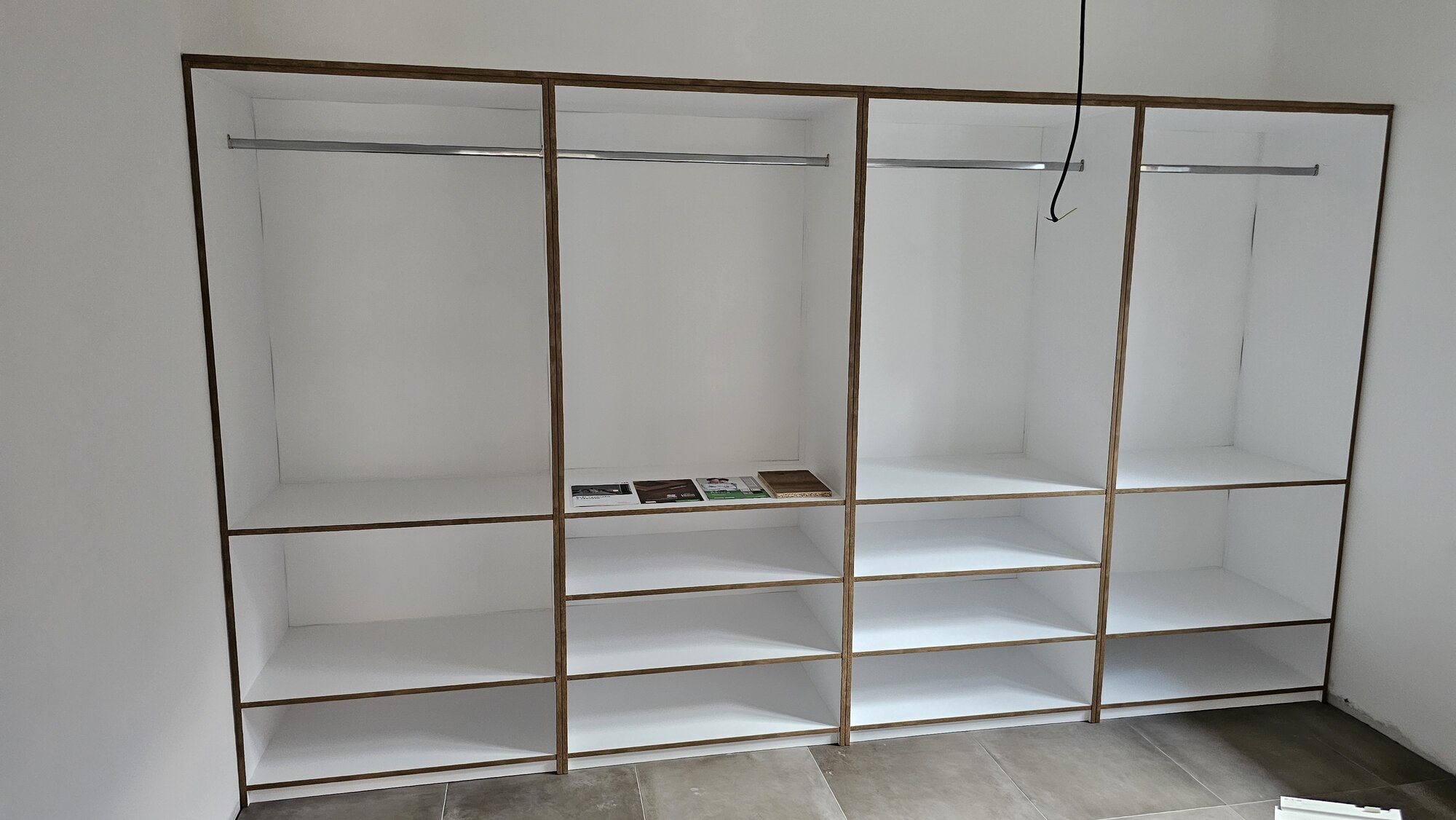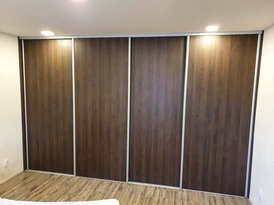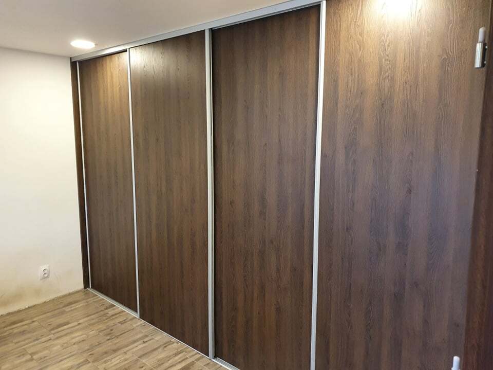 Vestavěná skříň v dekoru tmavého ořechu působí elegantně a vytváří výrazný designový prvek interiéru. Bílé vnitřní provedení zajišťuje přehlednost, lepší viditelnost a opticky zvětšuje úložný prostor. Celek nabízí moderní vzhled a maximálně funkční řešení pro každodenní používání.